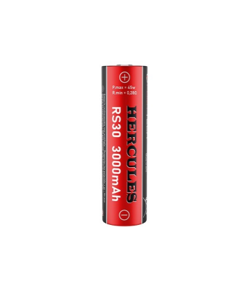 Accu RS30 18650 20A Hercules by Fumytech. Cet accu dispose d'une capacité de 3000 mAh et 20A en courant de décharge continu, pour une utilisation avec un mod électronique ou mécanique. L'accu RS30 possède une chimie Lithium-Ion pour une autodécharge minimale.