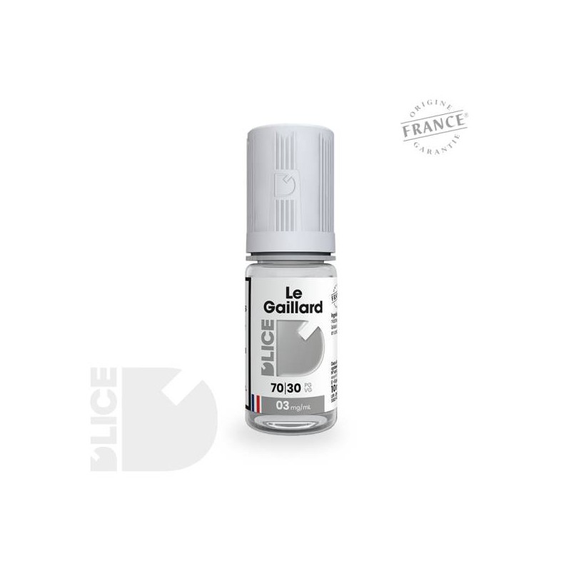 E-liquide Dlice GAILLARD, un e-liquide saveur tabac brun corsé pour ceux désirant une saveur explosive en gorge et pour les amateur de Gauloises. C'est du robuste ce e-liquide ! Un Classic brun corsé, pour les adeptes de brunes. Les e-liquides Dlice sont conditionnés en flacon PET de 10 ml avec bouchon sécurité enfant et verseur compte-goutte. Composition en PG/VG : 70%/30%. Les e-liquides Dlice pour votre cigarette électronique, sont fabriqués et assemblés en France par DLice avec des arômes d'origine française.