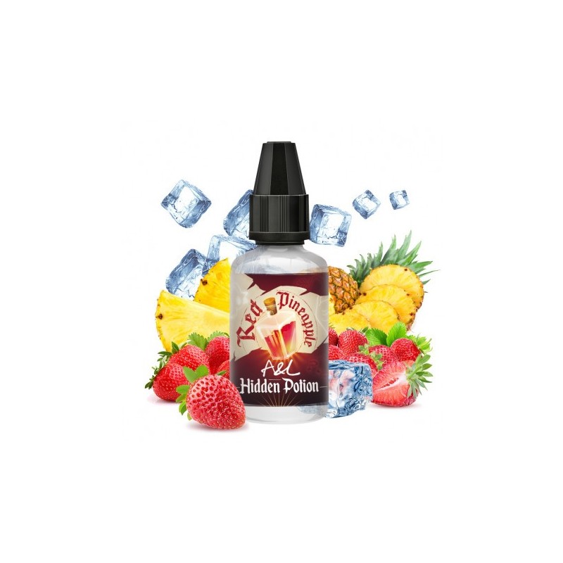 Le concentré Red Pineapple 30ml de la gamme Hidden Potion est un arôme concentré fabriqué en France par A&L et il est proposé en fioles souples de 30ml à embouts fins.