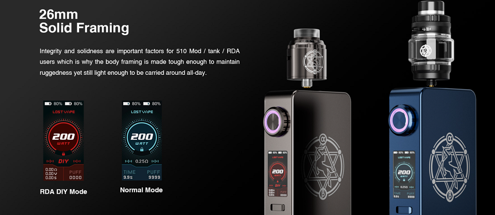Le Kit Centaurus M200 de Lost Vape est un mod coloré et élégant doté de superbes gravures distinctives. Avec une puissance maximale de 200 watts ajustable via une molette près du switch, il permet une personnalisation facile de la vape. Utilisant deux accus 18650 (non inclus) et équipé du chipset Quest 2.0, ce kit offre des performances solides. Les portes interchangeables offrent des options esthétiques variées.